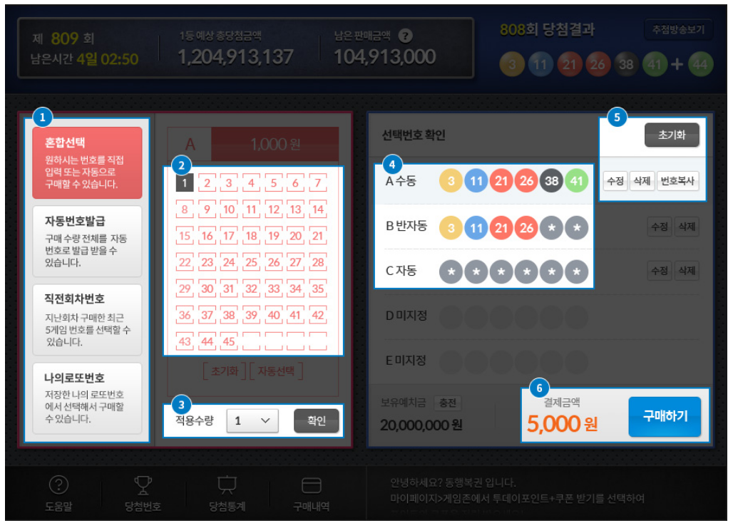 3) 적용 수량 : 선택한 번호에 대해 구매할 수량을 선택, 최대 5개까지 가능
