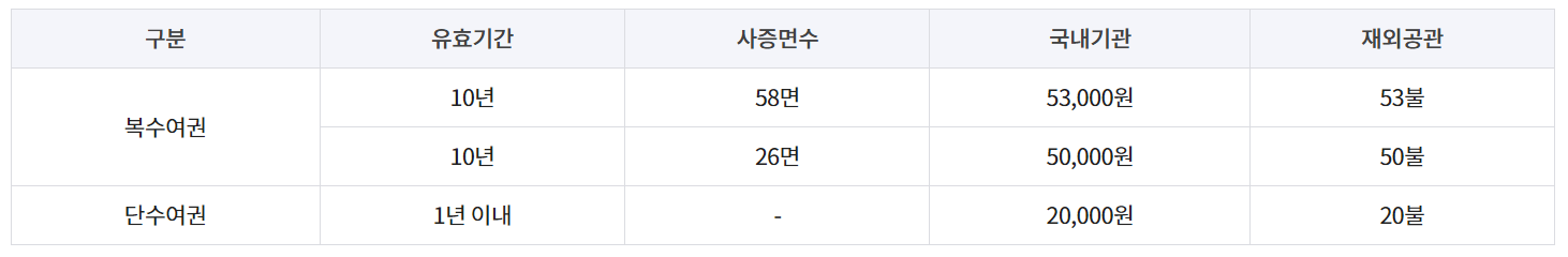 복수여권의 경우 유효기간 10년, 26면 사용의 경우 50,000원의 수수료를 내야합니다.