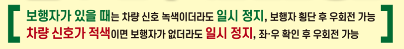 ① 차량 적색신호 때 보행자 유무 관계없이 정지선이나 횡단보도 앞에서는 일단 멈추고 난 이후에 우회전하도록 해야 합니다.