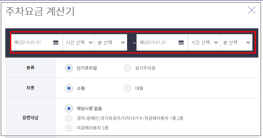 주차시간, 단기/장기 주차장, 차종, 감면대상에 따른 주차요금을 계산해볼 수 있습니다.